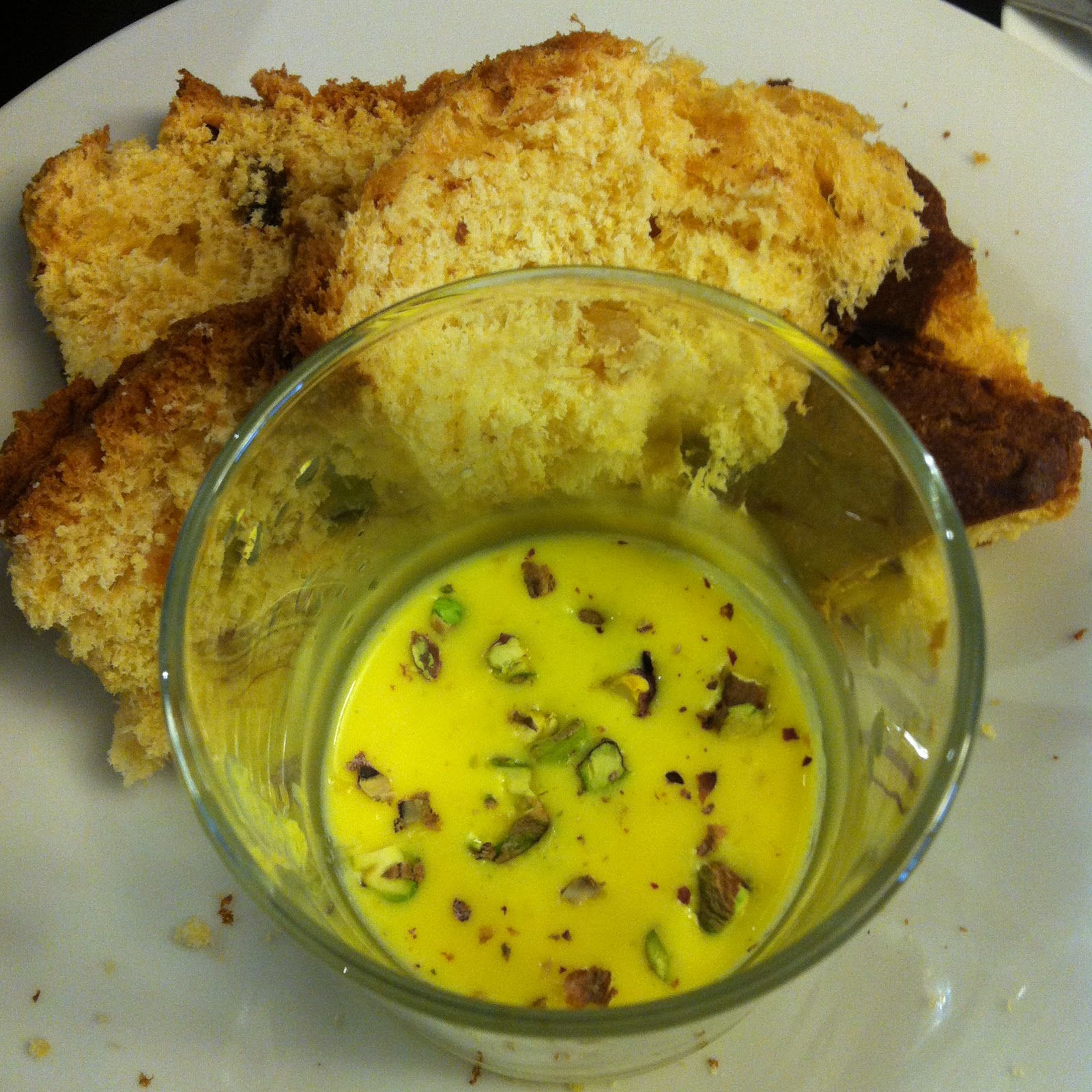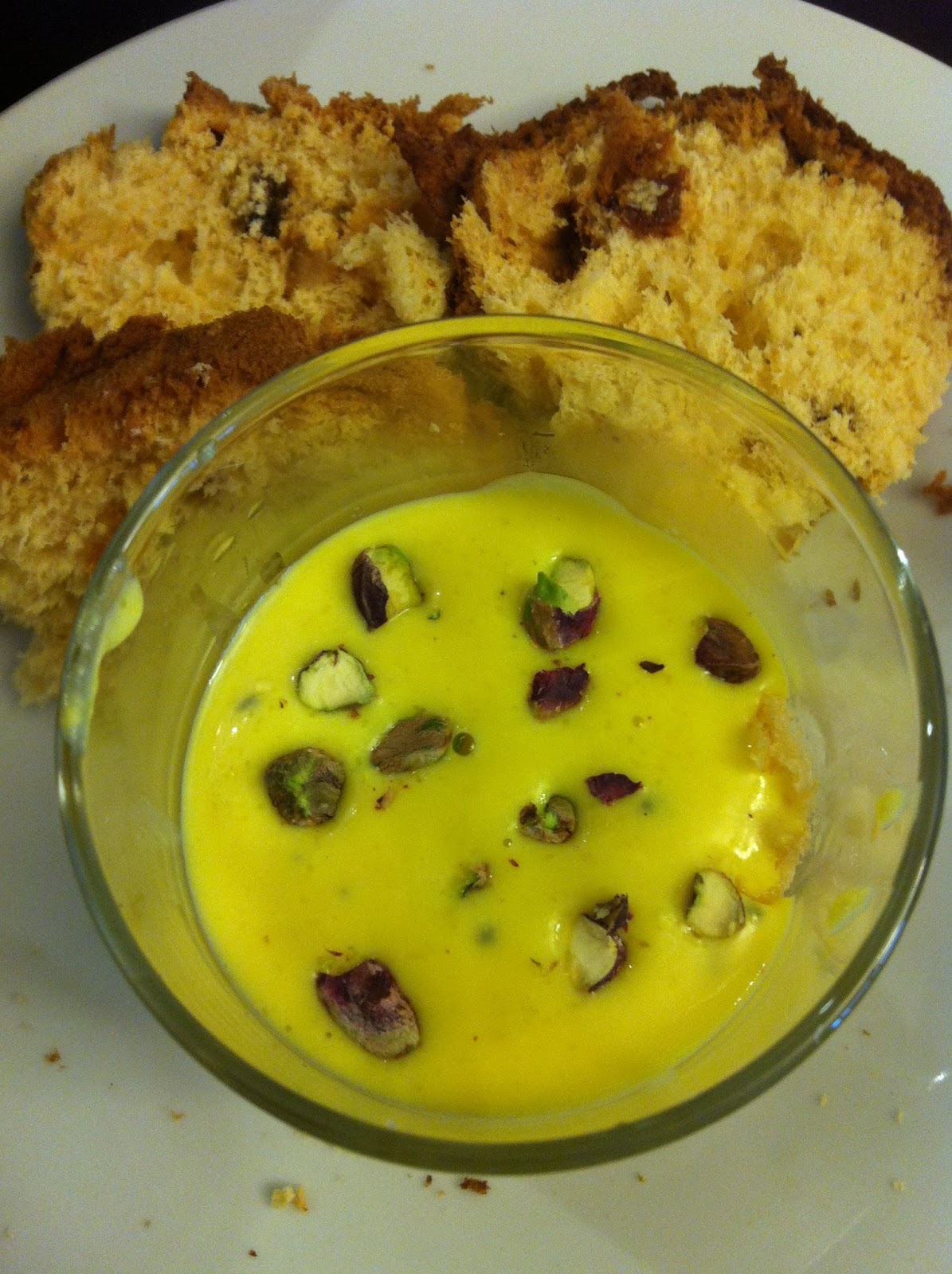 Ho pensato di fare una crema a base di acqua di rose, zafferano e pistacchi e servire il mio panettone avanzato con questa crema, per dargli un ulteriore opportunita' di essere gustato :)